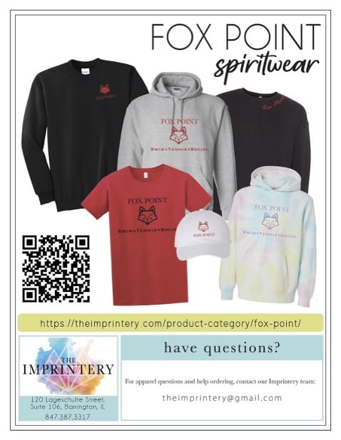 We have also partnered with The Imprintery for Fox Point spiritwear. There is no deadline for ordering spiritware and you can place your order at any time for delivery or free local pickup at their location in town. We plan to update the offerings seasonally. The direct link to our spiritwear page can be found here.
