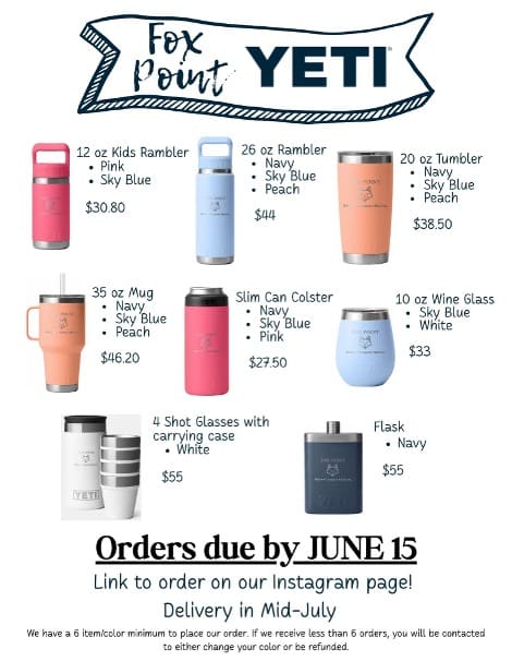 As promised, Fox Point Merch is back! We will be placing a one-time Yeti order on June 16th. Please place your order via the Sign-Up Genius link by June 15th. Expected delivery is mid-July.